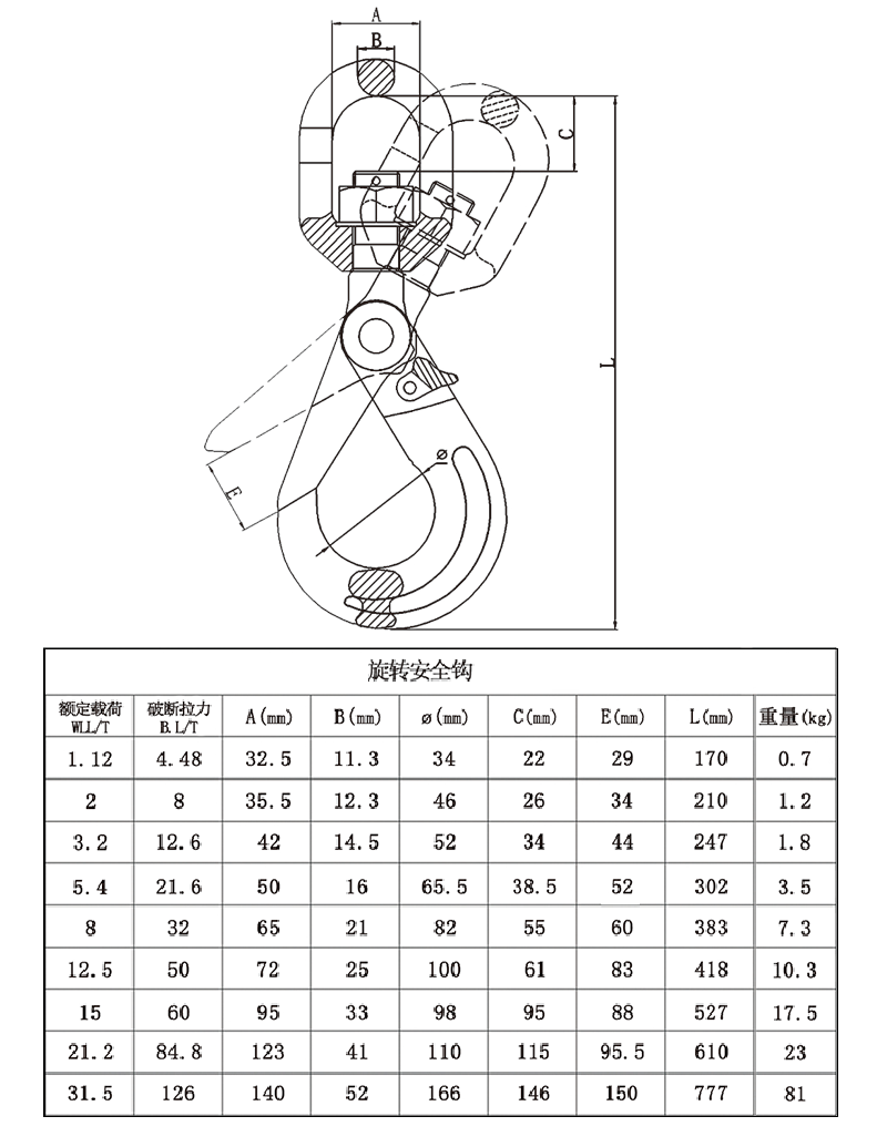 旋轉(zhuǎn)安全鉤技術(shù)參數(shù): 322A 322C Weight(kg) WLL/T B.L/T WLL/T B.L/T 1 4 3/4 3 0.35 1 1/2 6 1 4 0.58 2 8 1 1/2 6 1.04 3 12 2 8 1.18 4 1/2 18 3 12 2.2 7 28 5 20 4.71 11 44 7 1/2 30 7.46 15 60 10 40 10.65